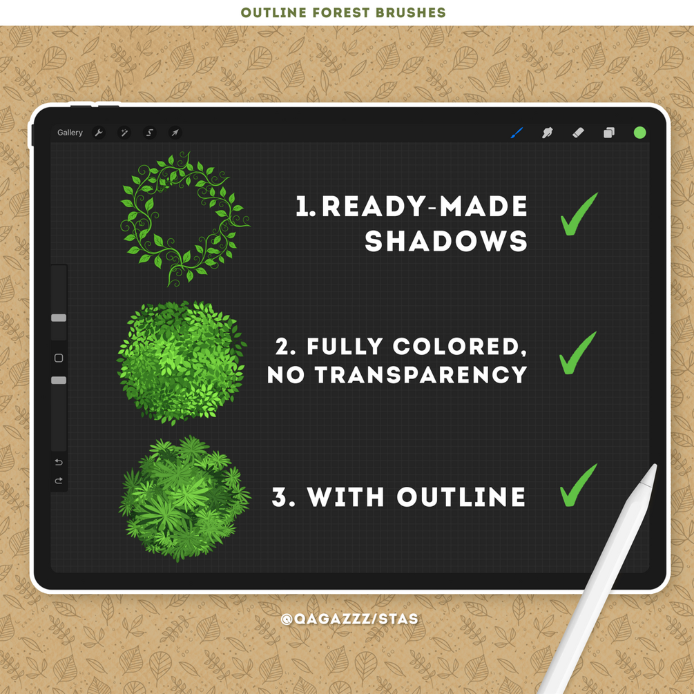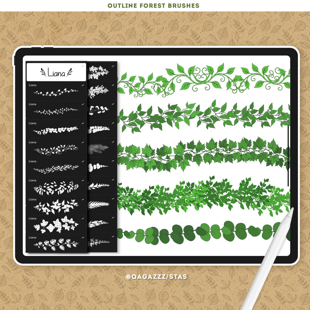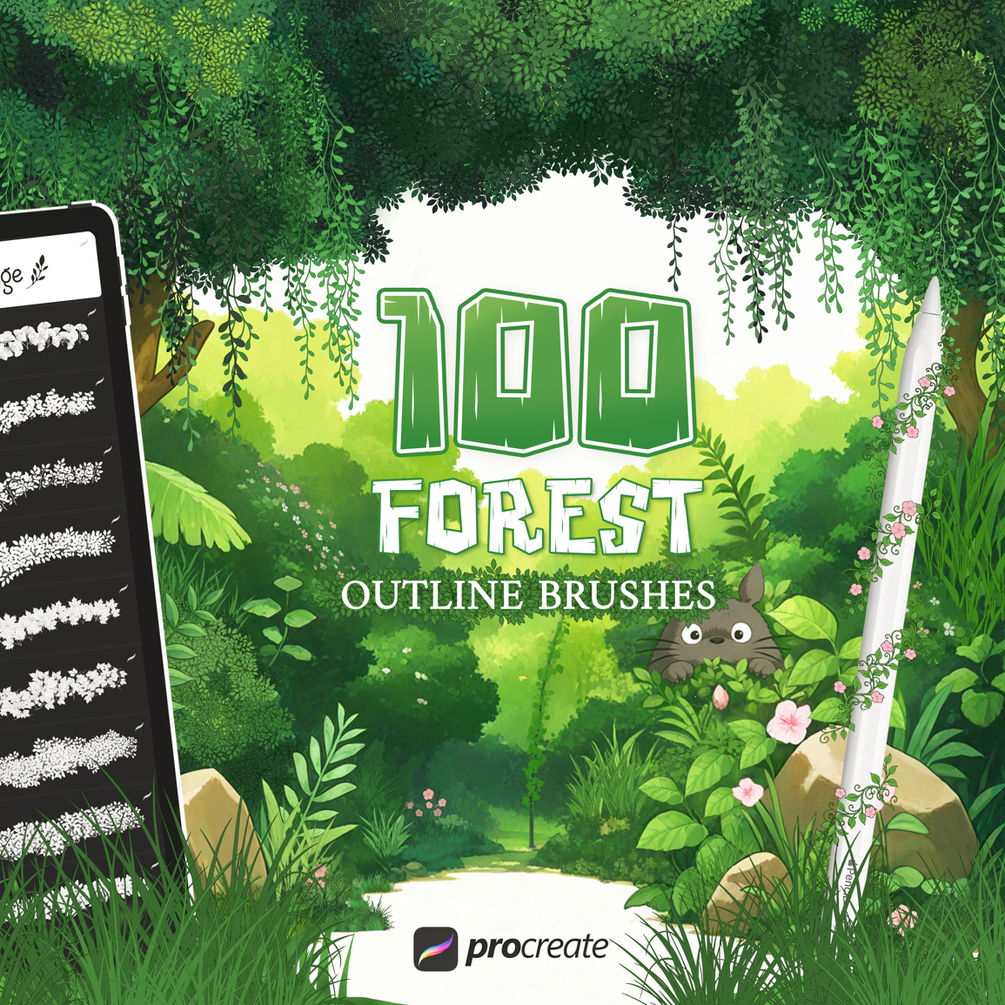 This collection includes 100 Procreate brushes specially designed for drawing and painting plants, trees, leaves, foliage, grass, vines, lianas, and flowers in just one stroke. These brushes are perfect for creating beautiful forest and nature-inspired artwork with ease — simply pick a color and start drawing. Each brush outlines and fills your plants simultaneously, saving time and boosting creativity.