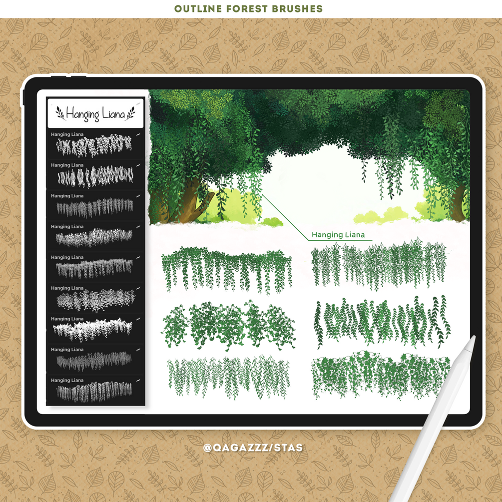 - 100 custom brushes: flying leaves, foliage, liana, hanging liana, grass, flowers, plants, trees, and more