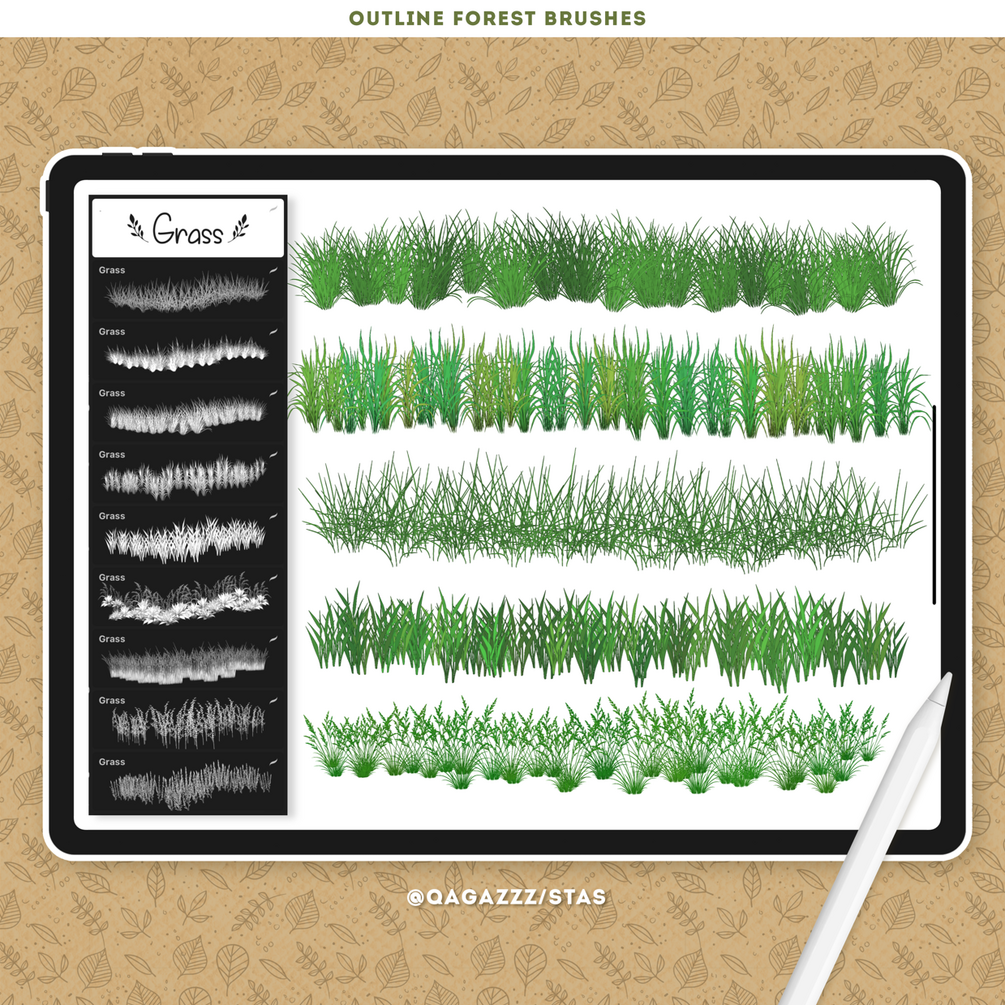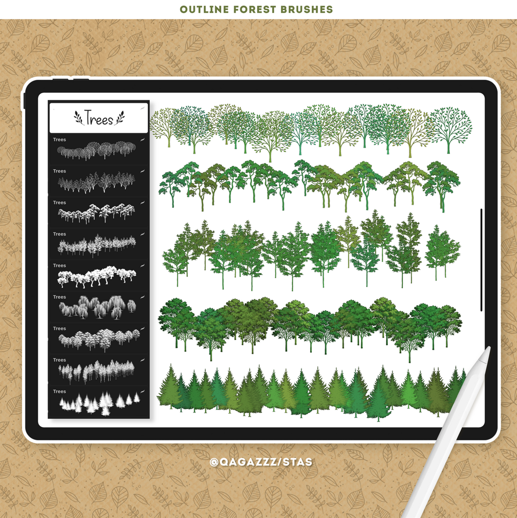 This collection includes 100 Procreate brushes specially designed for drawing and painting plants, trees, leaves, foliage, grass, vines, lianas, and flowers in just one stroke. These brushes are perfect for creating beautiful forest and nature-inspired artwork with ease — simply pick a color and start drawing. Each brush outlines and fills your plants simultaneously, saving time and boosting creativity.