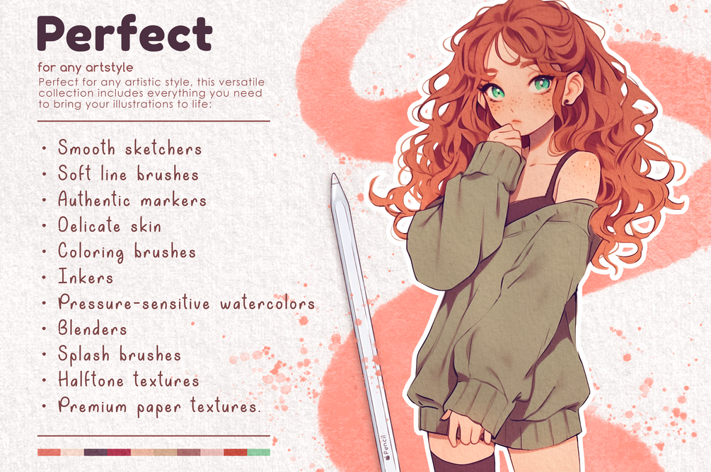 Perfect for any artistic style, offering a diverse selection of tools: smooth sketchers and soft line brushes, authentic markers for bold designs, delicate skin and coloring brushes, precision inkers, dynamic watercolor (pressure-sensitive tips), blenders, splash brushes for dramatic effects, halftone textures, and premium paper textures to give your work that final touch of perfection.