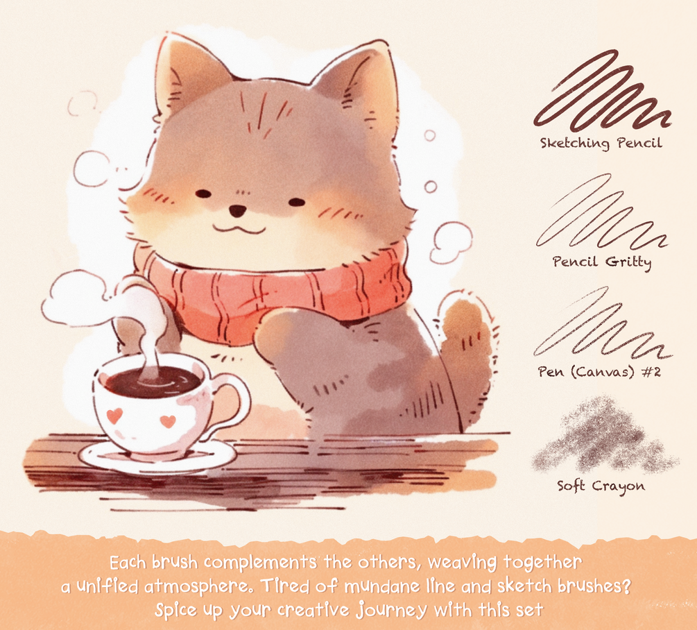 These brushes are your gateway to a cozy, soft ambiance for your artworks. With 9 brushes from the free version set, dedicated to sketching, lining, and texturing, this collection enhances your style with a delightfully rough edge. Each brush complements the others, weaving together a unified atmosphere. Tired of mundane basic Procreate brushes? Spice up your creative journey with this set:
