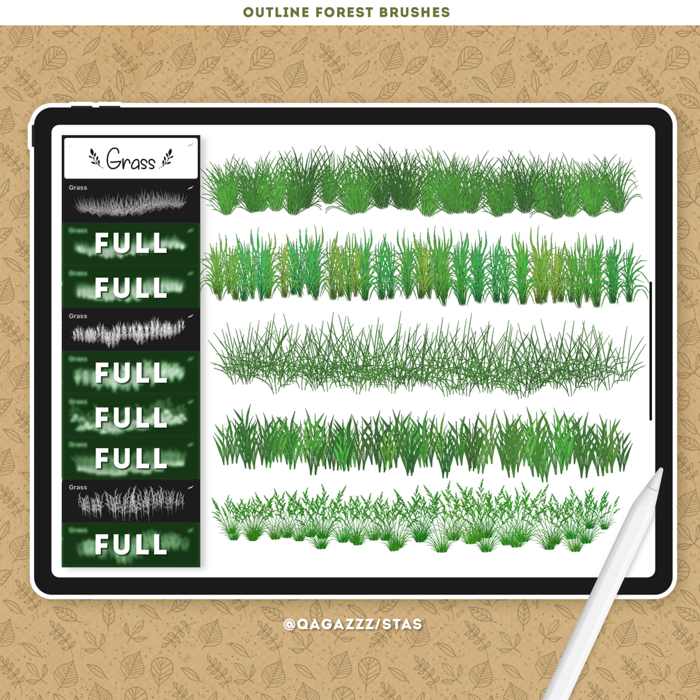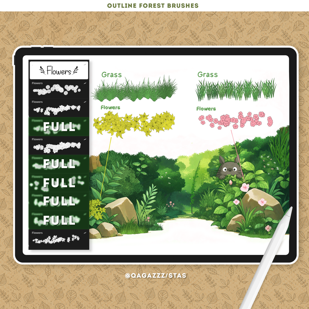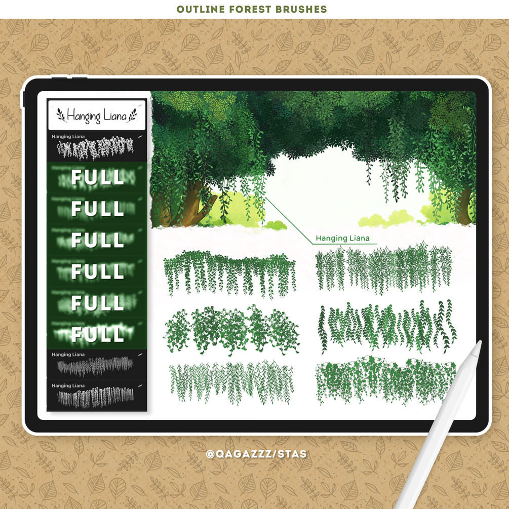 • 20 custom brushes: flying leaves, foliage, liana, hanging liana, grass, flowers, plants, trees