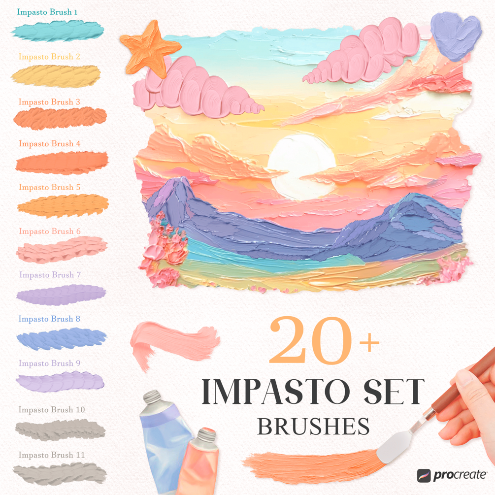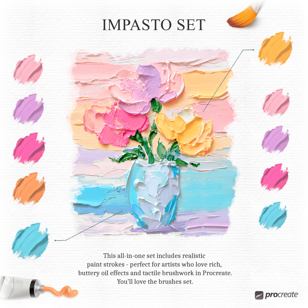 These Procreate realistic oil and impasto brushes made for smooth, quick painting on digital canvas. Create expressive oil, impasto, and gouache illustrations with authentic brush texture and depth. This all-in-one set includes realistic paint strokes, canvas-ready textures, and Procreate stamp brushes — perfect for artists who love rich, buttery oil effects and tactile brushwork in Procreate.