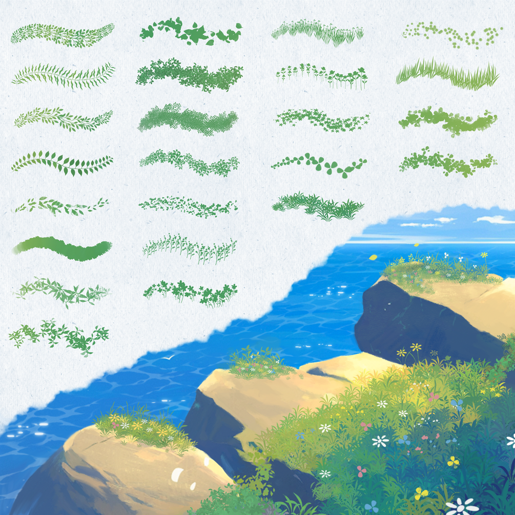 Soft Ghibli Style Brushes for Procreate | Grass, Foliage, Flowers, Water, Cloud Brushes