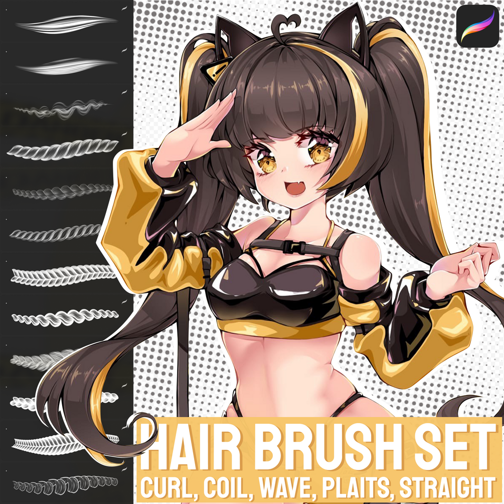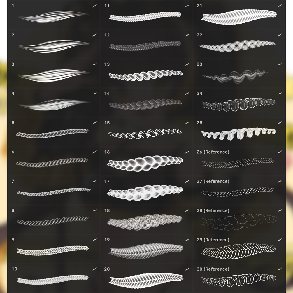 Hi! There are 30 brushes in this set that will help you draw different types of hair, for example: curl, coil, wave, plaits, straight. You can watch a video where I use these brushes in action📹