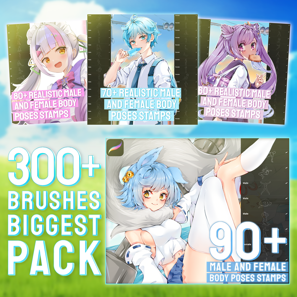 Hi! In this pack I've combined all the pose brush sets that I have in my store. Also, I added to this pack a new set of 60 pose brushes that you won't find in my store.
